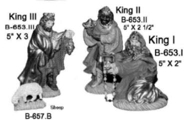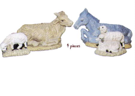 Angel, Baby, Manger, Joseph, Mary, Shepherd, Three Kings, Standing Camel, Two Camels Lying, Cow and Donkey, and Lambs #0651/57set