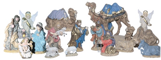 Angel, Baby, Manger, Joseph, Mary, Shepherd, Three Kings, Standing Camel, Two Camels Lying, Cow and Donkey, and Lambs #0651/57set
